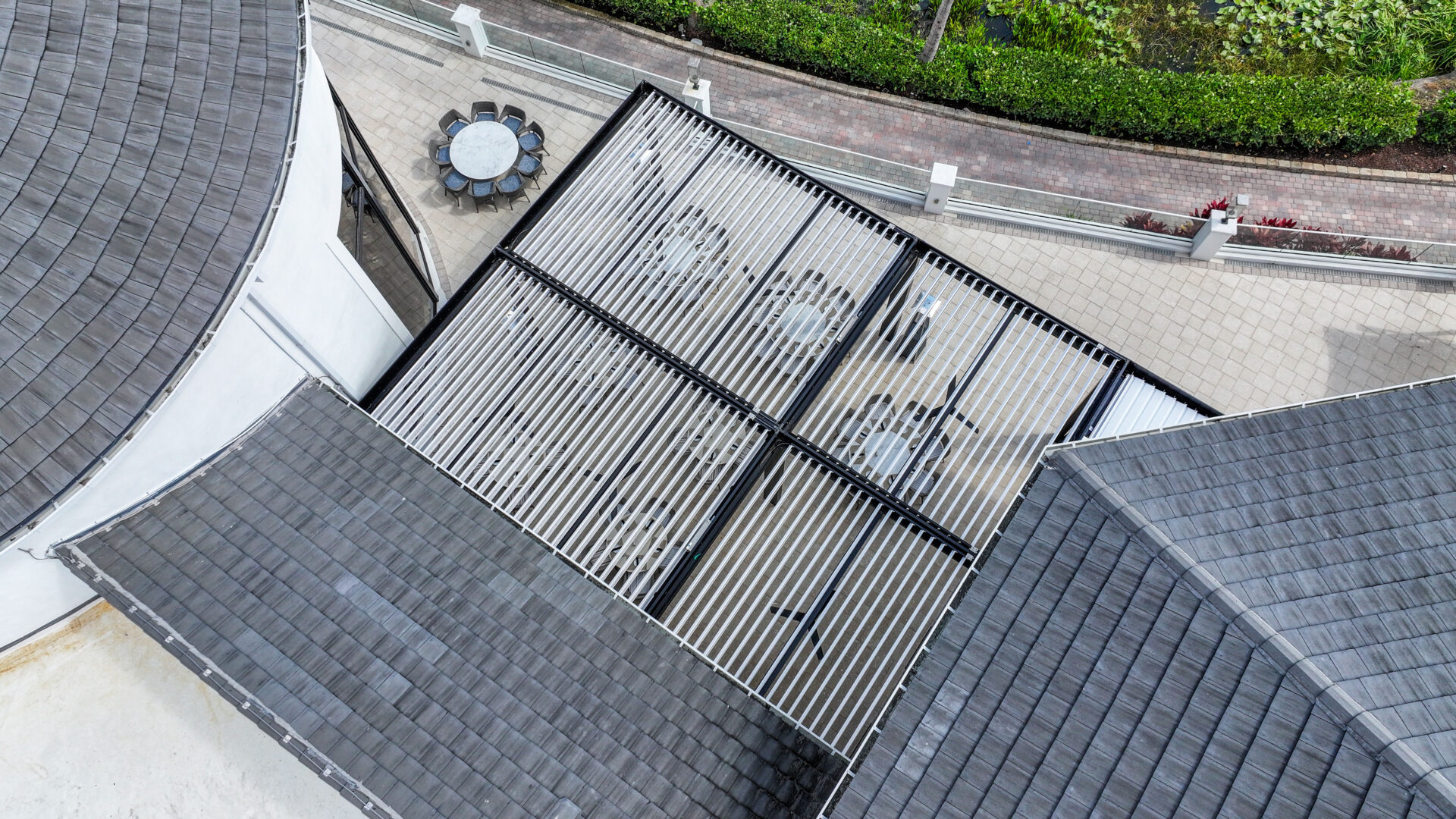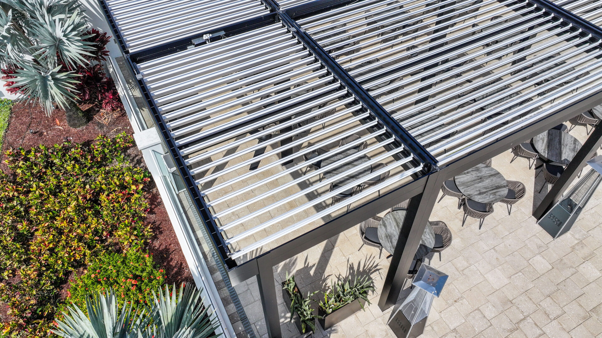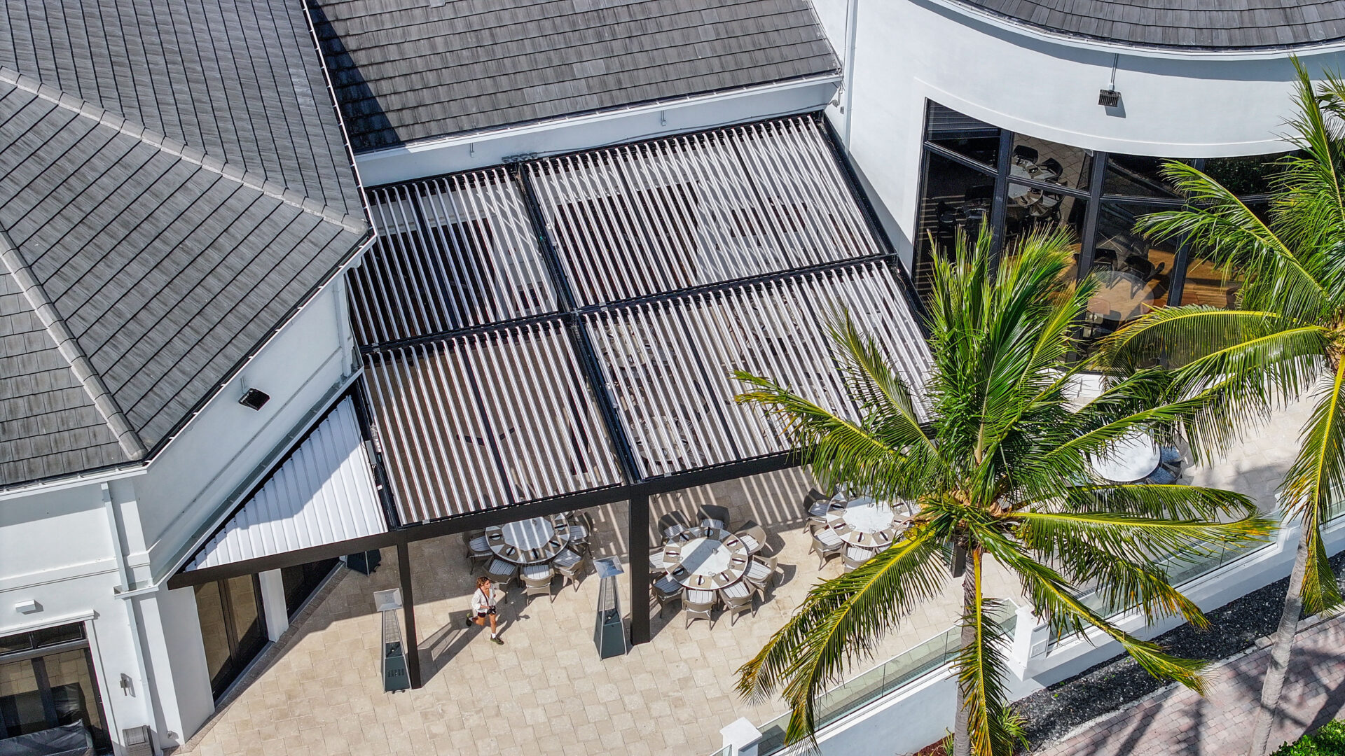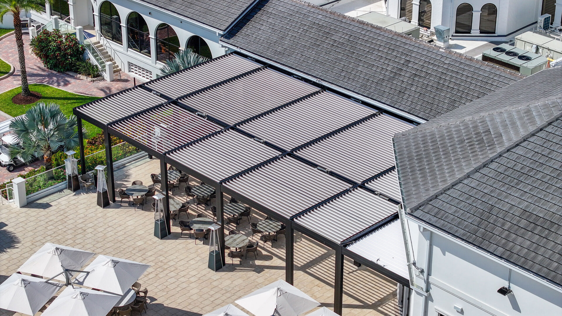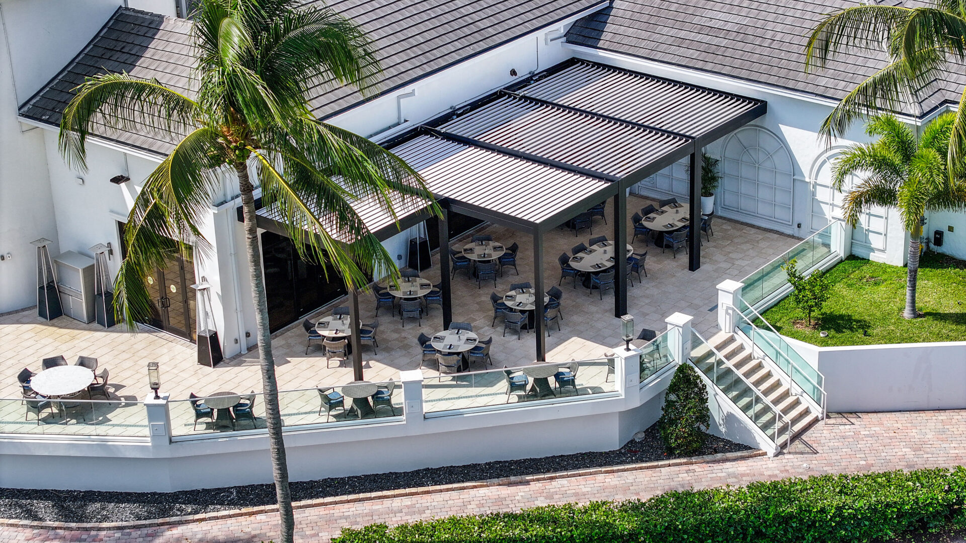 SYZYGY Global designed a site-specific engineered R-Blade pergola that brings refined structure and dependable performance to the heart of the patio. The motorized louvers allow staff to adjust sunlight and airflow throughout the day, and the fully integrated drainage system protects the surrounding architecture and landscaped areas. Durable aluminum construction and concealed marine-grade stainless steel hardware preserve the clean aesthetic that members expect from one of Boca Raton’s premier private clubs.