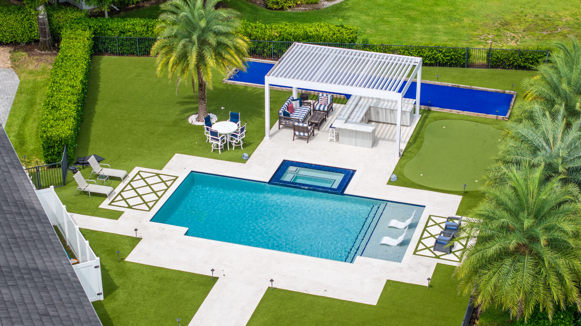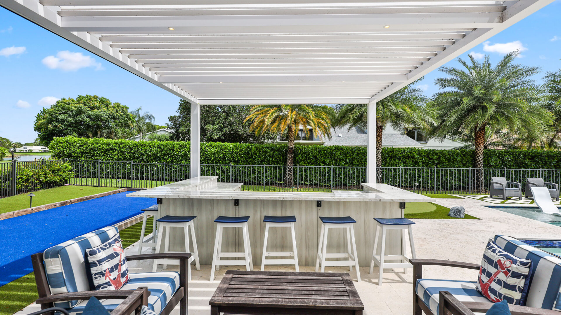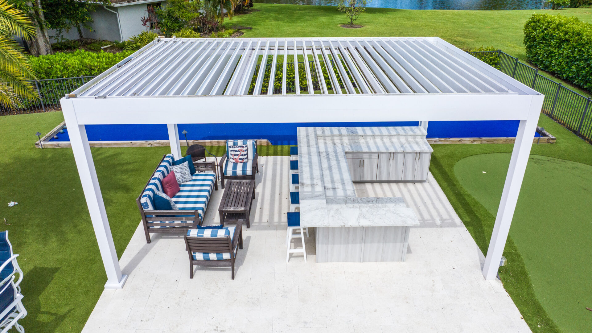 SYZYGY Global designed a site-specific engineered R-Blade pergola that anchors the outdoor living zone with elegance and purpose. The adjustable louvers allow the family to tailor sunlight and airflow for cooking or gathering, while the streamlined aluminum frame keeps the design feeling open and airy. Its crisp white finish complements the surrounding hardscape and reflects the coastal palette of the property.